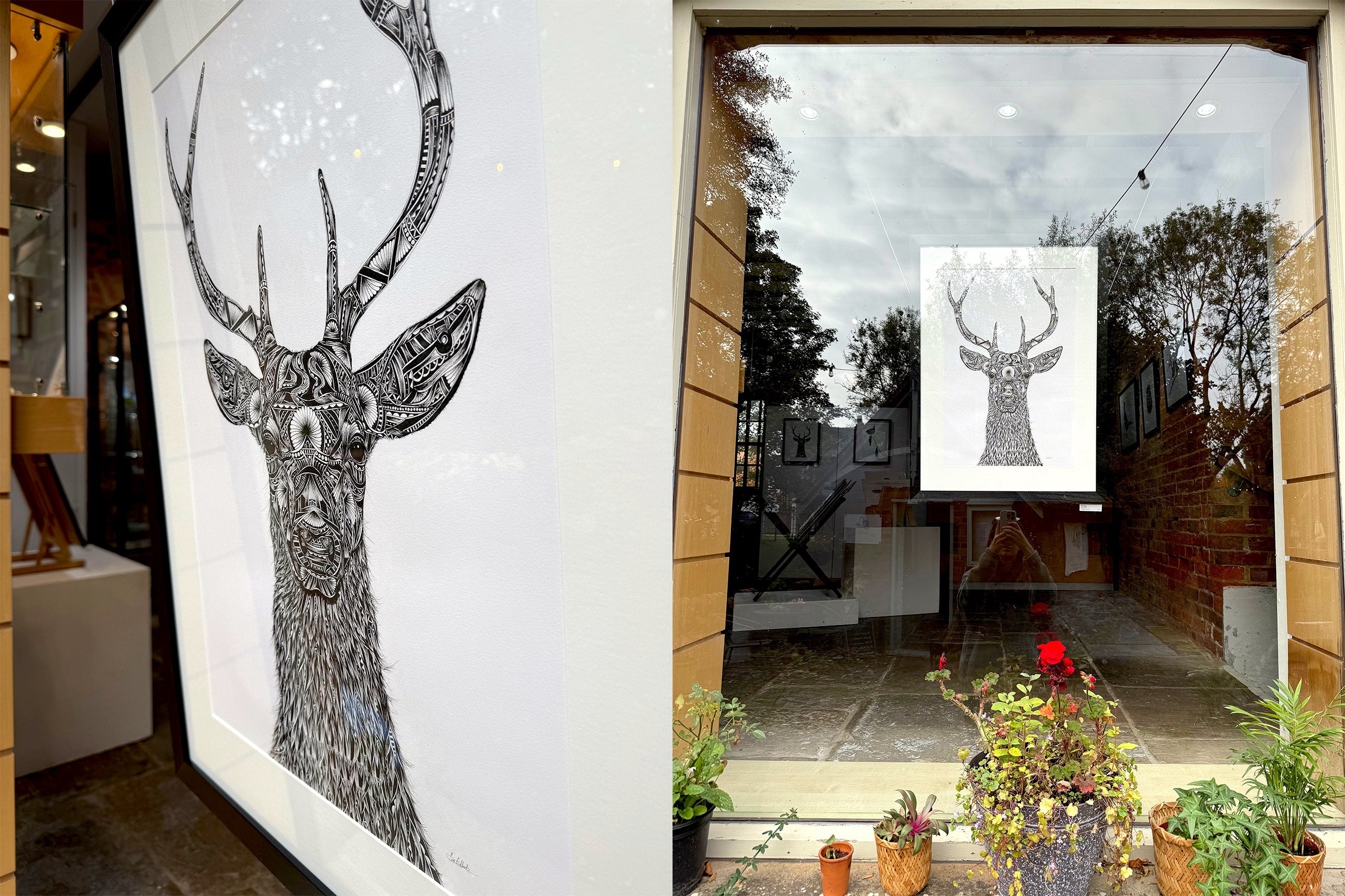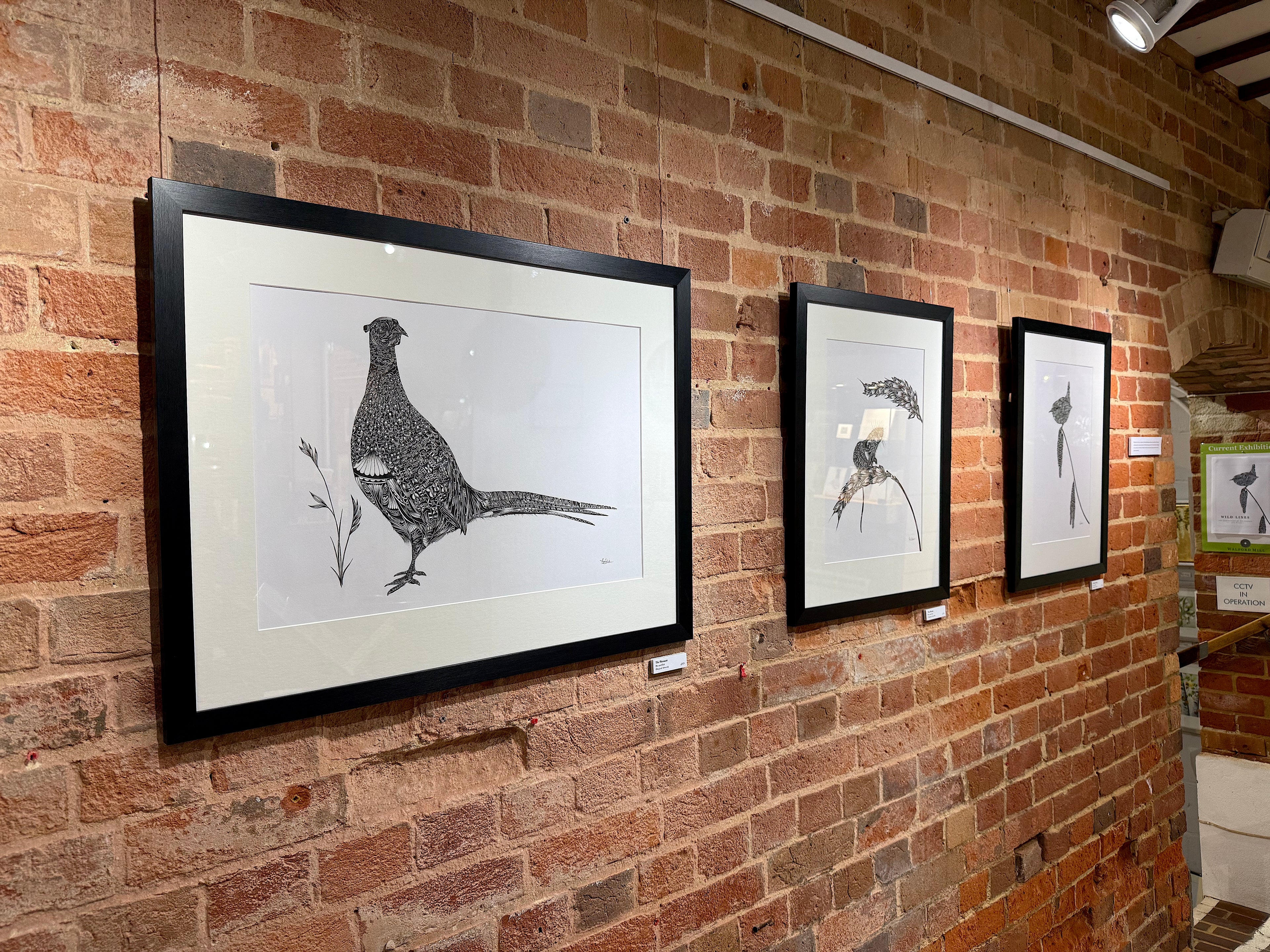 Seeing the work displayed together was a joy, allowing the individual pieces to speak to one another in a way that isn’t always possible in my little studio. Each animal seemed to complement the next and I particularly enjoyed the works that included glimpses of the surrounding landscape. The gallery space itself played a gentle but important role. The black and white ink felt at home against its rustic textures and the setting of the old mill lent a quiet authenticity that echoes the natural world the collection draws from.